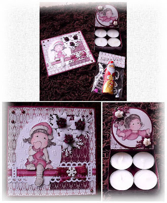 This mega nice set me the love Marina sent. It consists of a beautifully designed card, a Teelichtbox and a bag full of nice Embellie Topper.