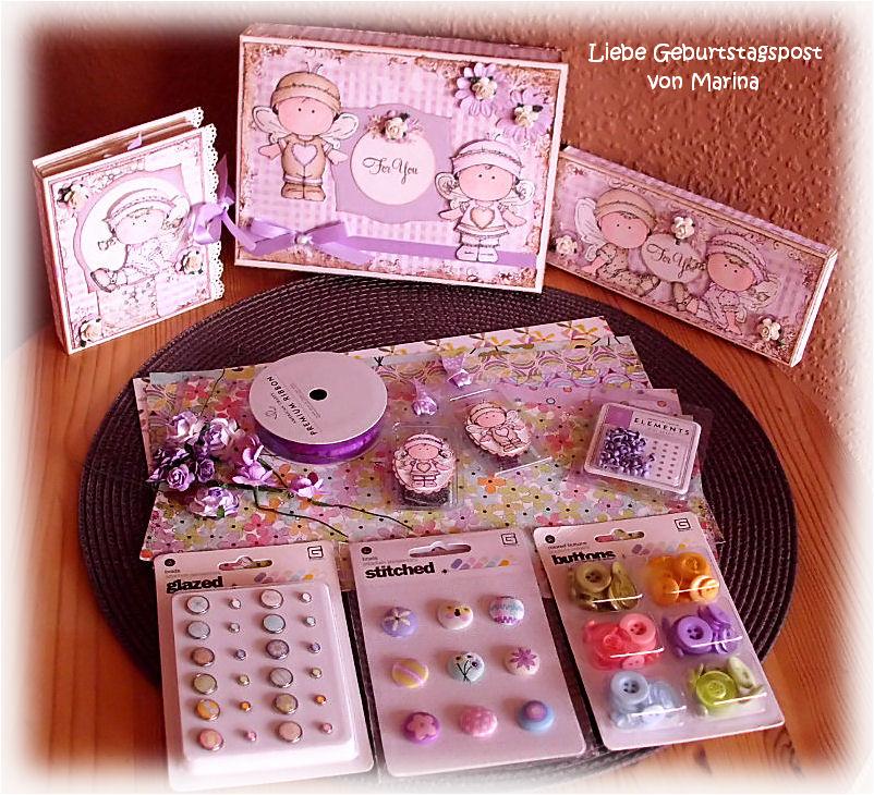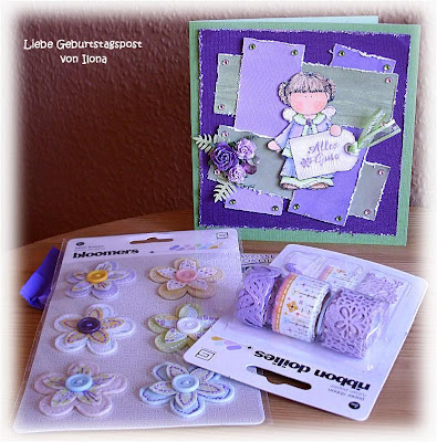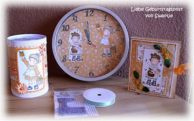 ... this mega nice set I got from dear Swantje / stamp Mausi , it is a money-box, a clock (the grace from now on my craft corner) a book card (filled with goodies) a sweet punch and a great ribbon ...