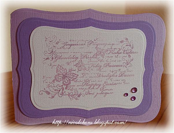 for the first card I cardstock used in 2 different shades of purple. I punched the card with label 8 from Spellbinders. The image is from the stamp set * Easter eggs and borders * Viva Decor , and I stamped it with Chalk * Wisteria * on white cardstock. I've only works adorned with 3 small Rhinstones as the subject for themselves.